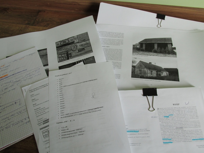 Przez kilka następnych dni, aż do końca weekendu, w kwestii prac nad książką panował względny spokój. Korektorka miała teraz czas, aby wszystko sprawdzić i nanieść ewentualne uwagi. W międzyczasie – do 8 czerwca włącznie – pracowałem nad graficznym projektem okładki. 10 czerwca pojechałem do Opola po odbiór wydruków z naniesionymi ręcznie korektami. Korekty te dzieliły się na dwie kategorie: pierwsze z nich naniesione były długopisem i dotyczyły głównie błędów ortograficznych i stylistycznych; pozostałe uwagi naniesione były ołówkiem i skierowane były do mnie, tzn. miałem się zastanowić i je zatwierdzić, albo też pozostać przy swoim zdaniu. Tym oto sposobem cały dzień spędziłem na sprawdzaniu otrzymanego materiału.