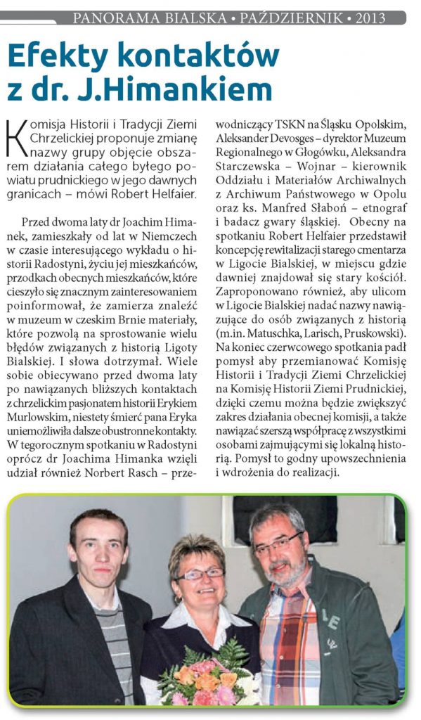 Na spotkaniu przedstawiono m.in.: historię Ligoty Bialskiej; omówiono pozyskany z opolskiego archiwum i pochodzący z 1758 r. urbarz dóbr chrzelickich, a także przedstawiono propozycję rewitalizacji „starego” ligockiego cmentarza oraz nadania ulicom w Ligocie nieoficjalnych nazw, nawiązujących do historii miejscowości. Na koniec przedstawiono propozycję powołania do życia komisji historycznej, która swoim zasięgiem obejmowałaby cały dawny powiat prudnicki, w jego historycznych granicach.