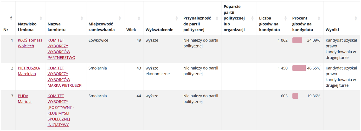 - jego kontrkandydat Tomasz KÅ‚oÅ› – zdobyÅ‚ 1.062 gÅ‚osów (34,09%).